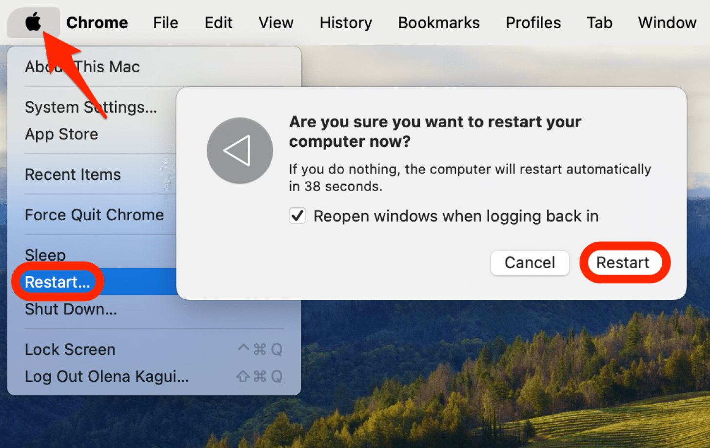 간단한 재시동이 기술적인 문제를 해결할 수 있습니다. 맥을 재시동하려면